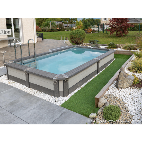 La structure des piscines Azteck (à poser sur dalle béton ferraillée de 17 cm minimum, sans réservations) se compose de panneaux en alliage Alu-Zinc inoxydable. Ces derniers s'assemblent très simplement grâce à des poteaux du même alliage par boulonnage inox. La grande solidité de cette piscine vous permet d'envisager de longues années de plaisir. L'habillage en bois composite s'installe par la suite et donne le bel aspect extérieur qui vous a certainement séduit. Le coloris du bois composite est au choix, il existe dans des nuances marrons (Colorado ou Exotique) ou des nuances de gris (Anthracite ou Iroise).